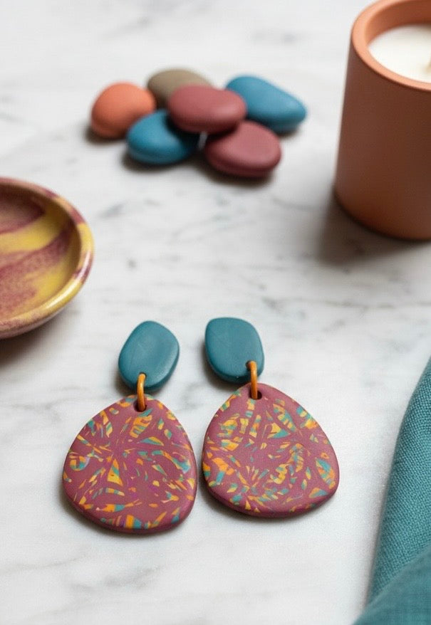 Inspirados en la belleza natural, los pendientes Gaia celebran la armonía terrosa a través del color y la forma. Su base de color rojo arcilla intenso se ve jaspeada con cálidos amarillos, naranjas, verde azulado y verdes suaves, evocando la tierra estratificada, el follaje cambiante y los paisajes soleados.
