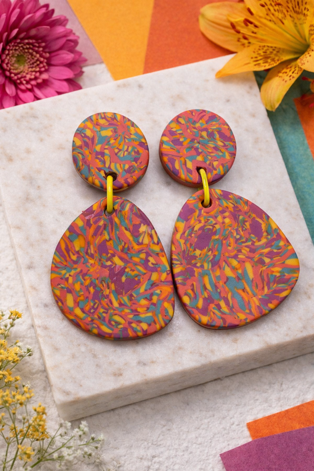 Haz una declaración con Saya , un llamativo par de zapatos hechos a mano. arcilla polimérica Pendientes diseñados para celebrar el color, el movimiento y la individualidad. Con un vibrante diseño de terrazo en tonos óxido cálido, ocre dorado, naranja, amarillo y azul, cada par es verdaderamente único.