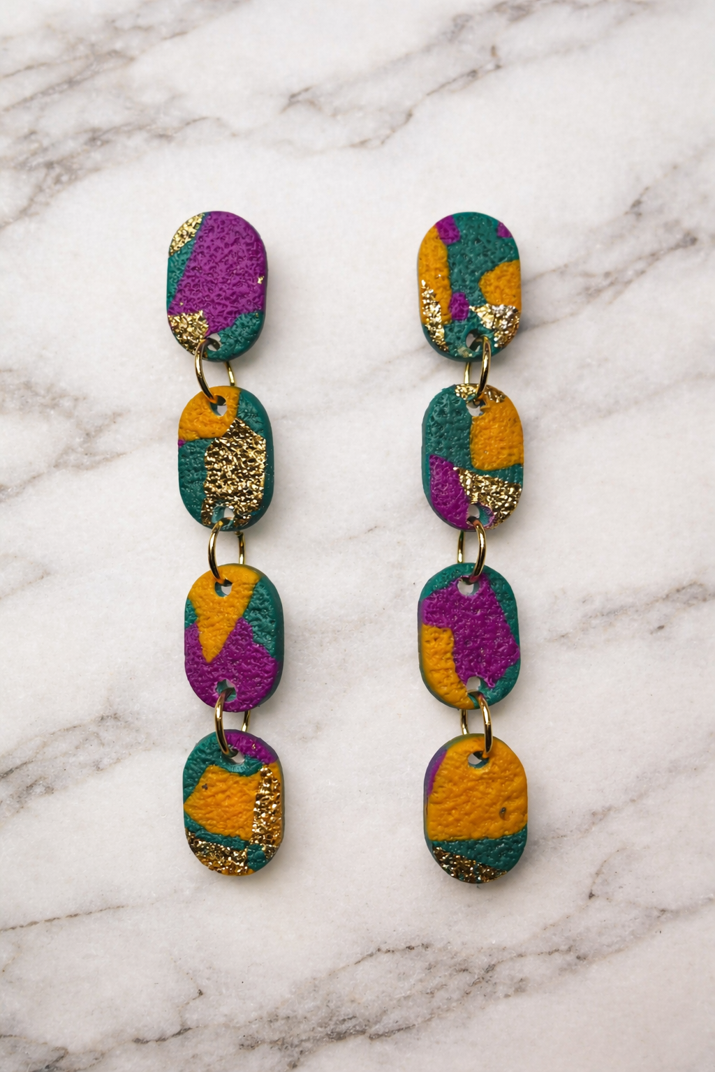 Elegantes, expresivos y con una audacia natural, los pendientes Lily Terrazzo están diseñados para destacar. Con una impactante combinación de verde azulado intenso, magenta vibrante y cálido amarillo dorado, cada pieza está acentuada con una lámina de oro brillante que le da un toque refinado de glamour.